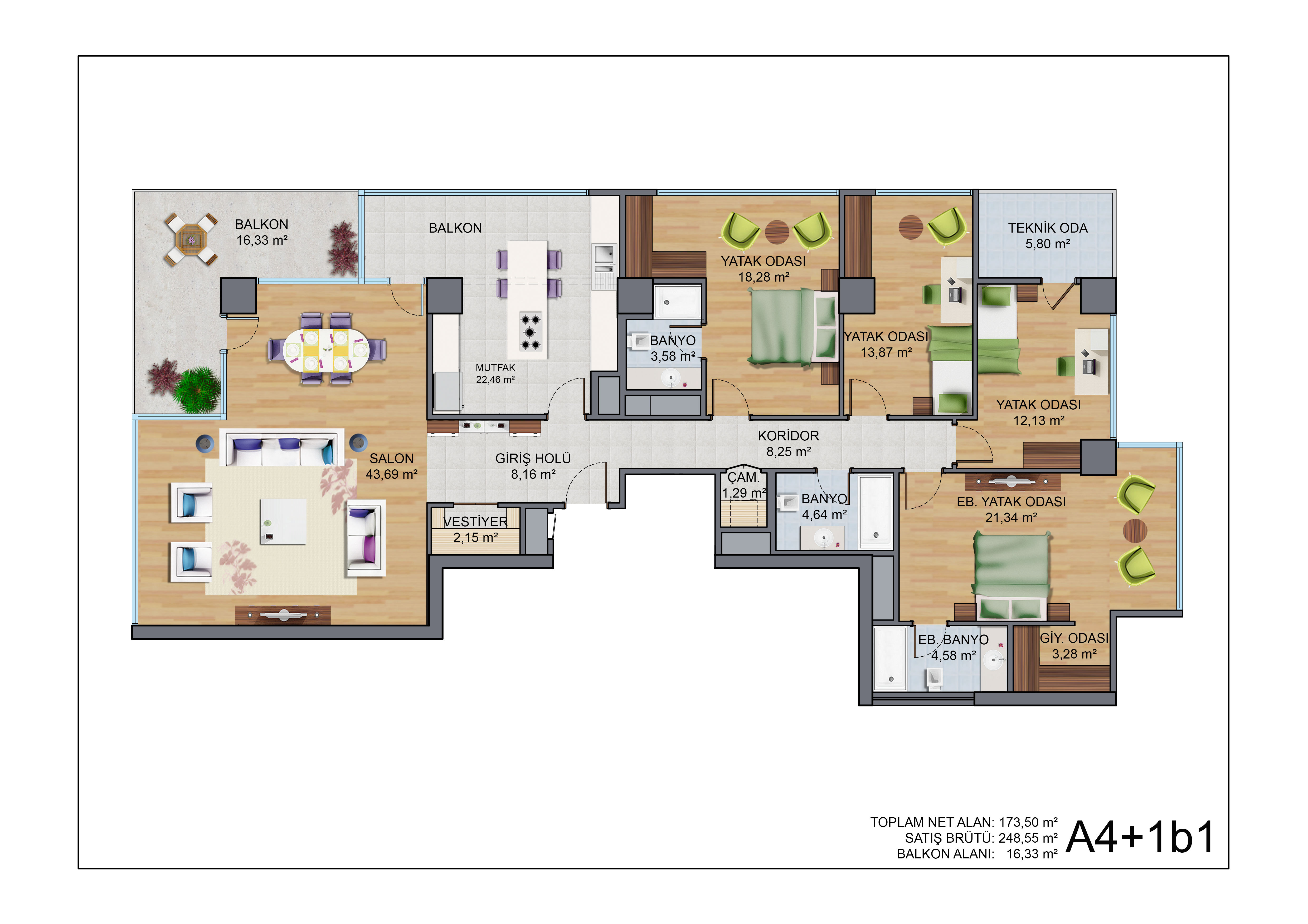 أيضاً شقق 4+1، بمساحة 249.4 متراً مربعاً، تمثل هذه الوحدات ذروة الفخامة والراحة، وهي مصممة لأولئك الذين يريدون مساحة كبيرة دون التضحية بالأناقة