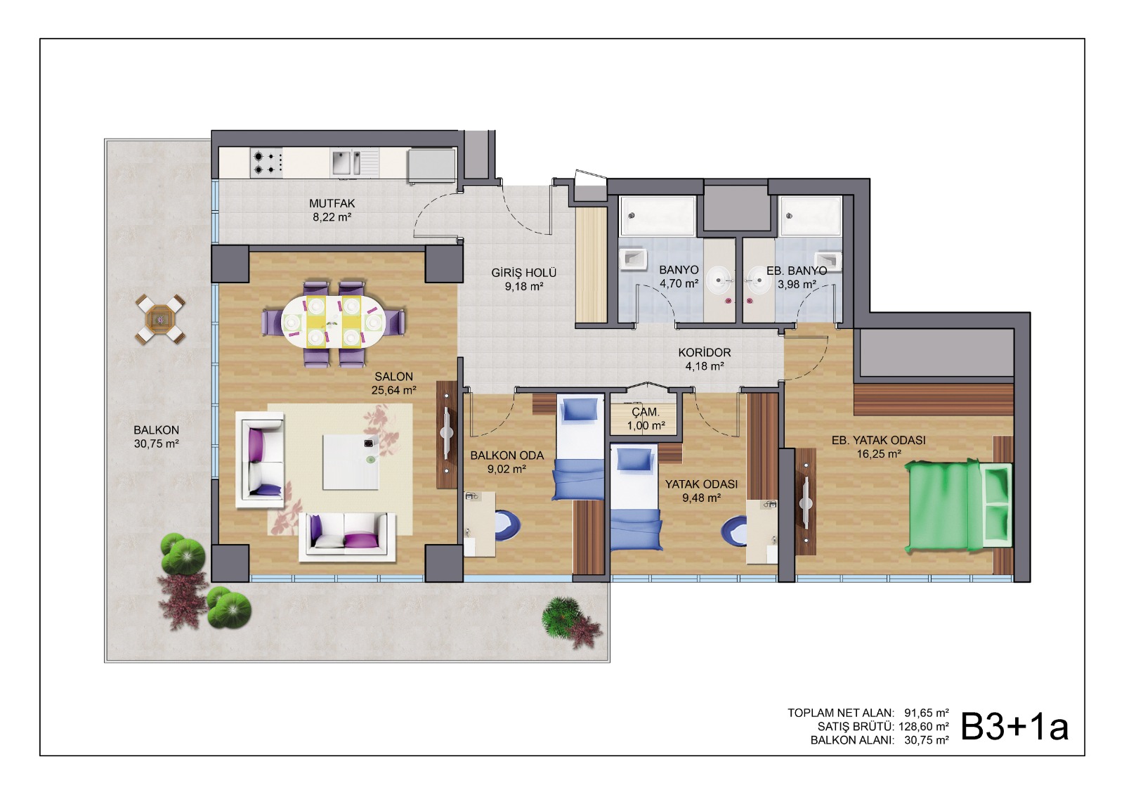 تتوفر شقق 3+1، تتراوح مساحة هذه الشقق بين 167.20 و170.61 متراً مربعاً وهي رائعة للعائلات الكبيرة